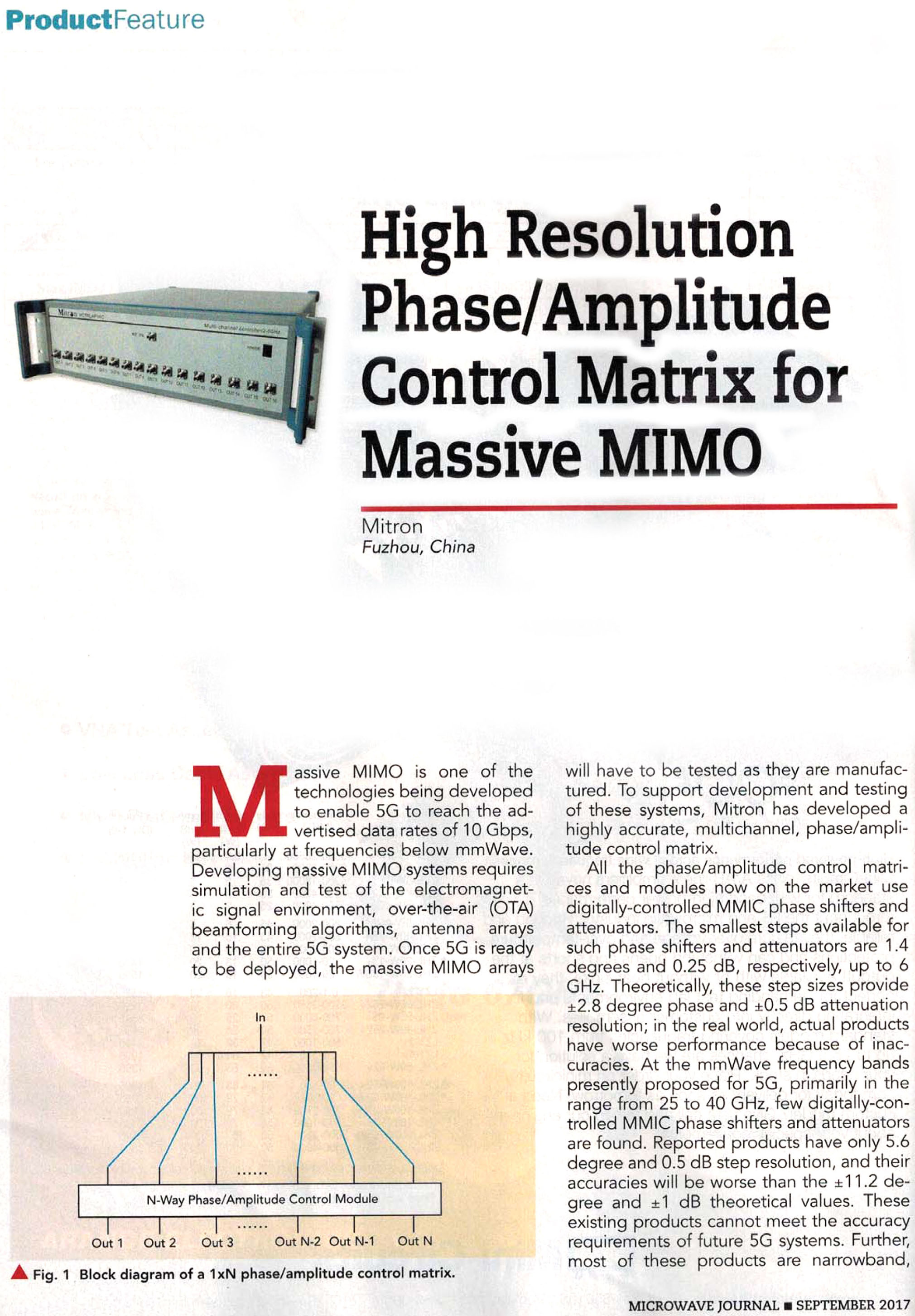 伟博电讯原创技术文章《适合于大规模MIMO应用的高分辨率幅相控制矩阵》发表于英文版《Microwave Journal》杂志